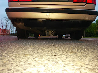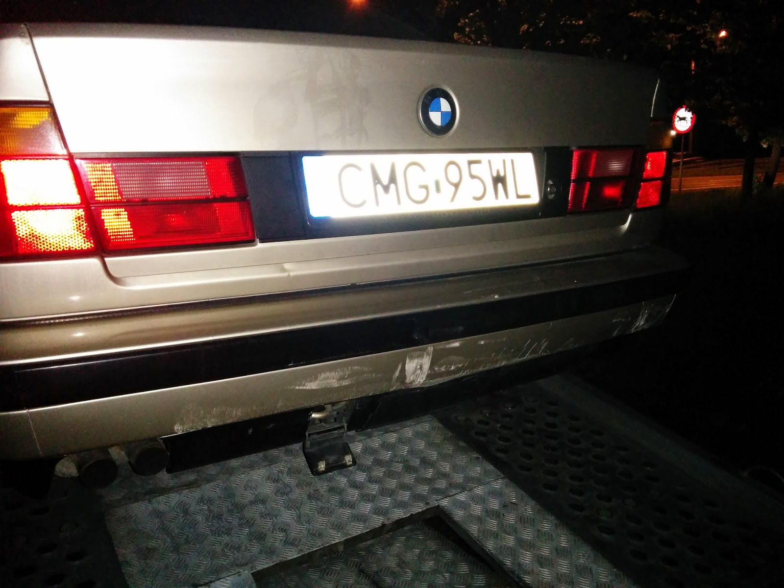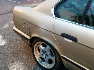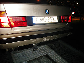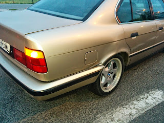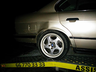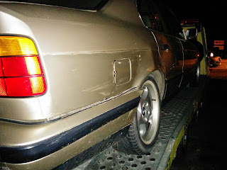 d) E34: Przód z oczywistych powodów nietknięty. Z tyłu podrapany zderzak, prawe tylne nadkole się wydęło, klapa bagażnika się nie zamyka, więc buda skrzywiona. Urwało się ucho dyfra, przez dziurę w deklu wyleciało trochę oleju, a sam dyfer zawisł na półosiach. Zastanawia mnie dlaczego silnik chodził na biegu a auto stało. Prawdopodobnie poszło jeszcze coś na drodze skrzynia-wał-dyfer. Odpadł plastikowy tył fotela kierowcy i wypadło radio od siły uderzenia.