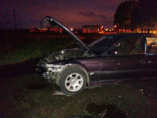 a) E38: kasacja. Uszkodzony zarówno przód jak i tył, oraz przedni i tylny lewy błotnik. Przedział pasażerski na pierwszy rzut oka nienaruszony, pasażerowie cali. Kierowca czuł się dobrze, ale na wszelki wypadek pojechał na pogotowie.