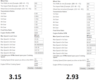 Dyfer udało się już załatwić. Będzie to szpera z przełożeniem 3.15. Patrząc na wyliczenia z kalkulatora, odpowiedniejszy byłby dyfer o przełożeniu 2.93, jednak jest już praktycznie niedostępny. Poniżej porównanie obu przełożeń (prędkości podane są w milach/h)